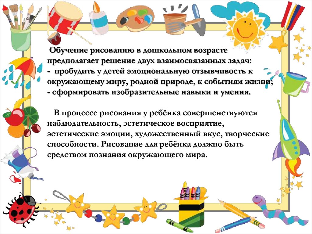 Обучение рисованию в дошкольном возрастепредполагает решение двух взаимосвязанных задач: