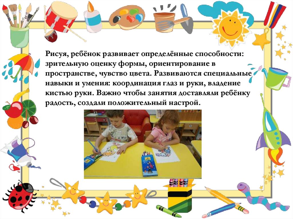 Рисуя, ребёнок развивает определённые способности:зрительную оценку формы, ориентирование в