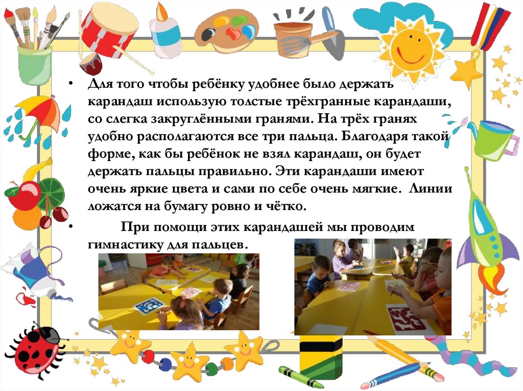 • Для того чтобы ребёнку удобнее было держатькарандаш использую толстые трёхгранные карандаши,