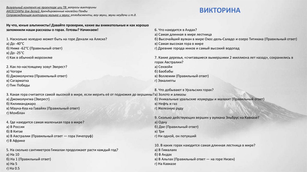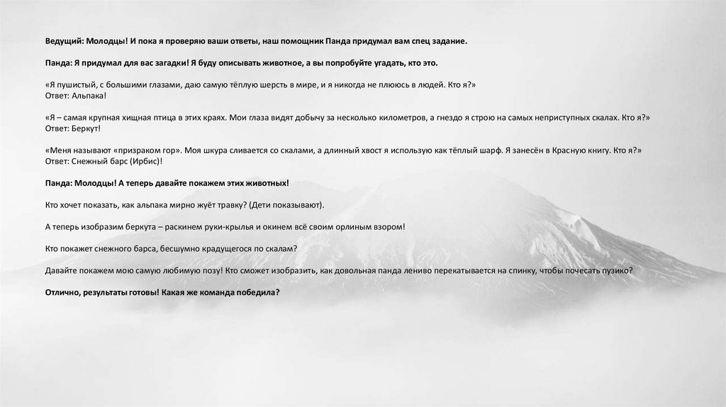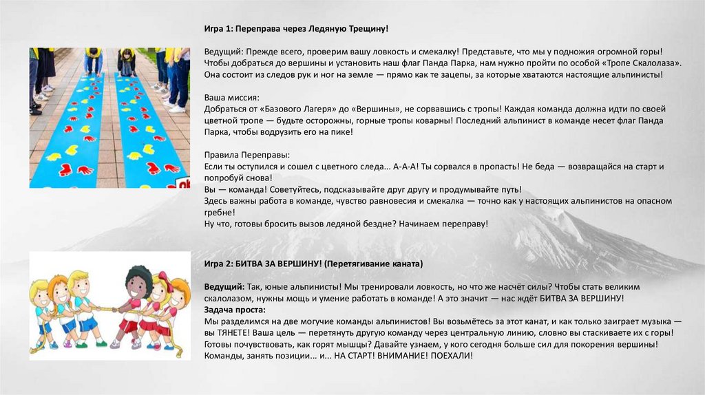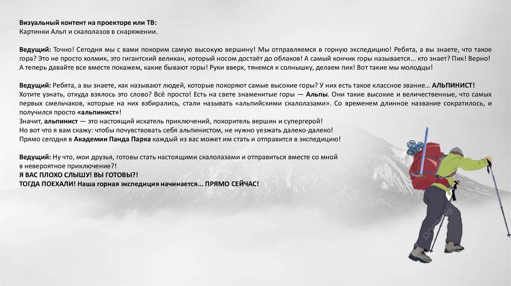 Ведущий: Ребята, а вы знаете, как называют людей, которые покоряют самые высокие горы? У них есть такое классное звание… АЛЬПИНИСТ!
