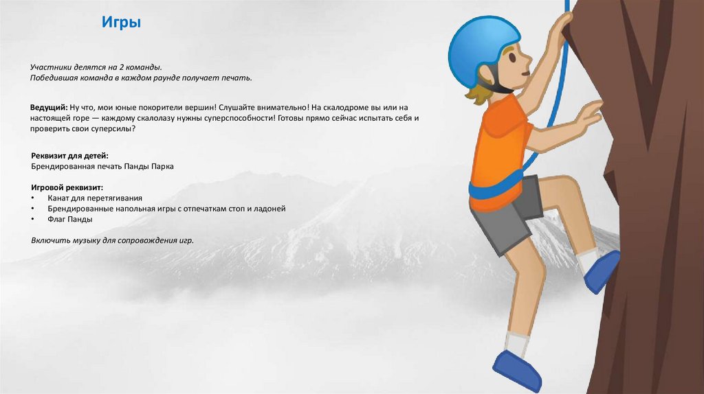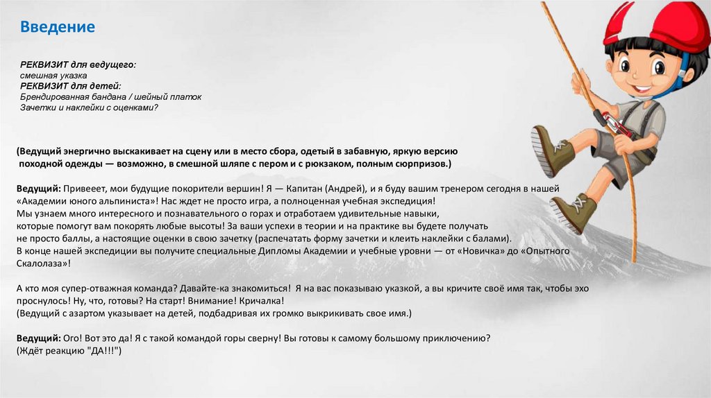 Ведущий: Ну что, мои юные покорители вершин! Слушайте внимательно! На скалодроме вы или на