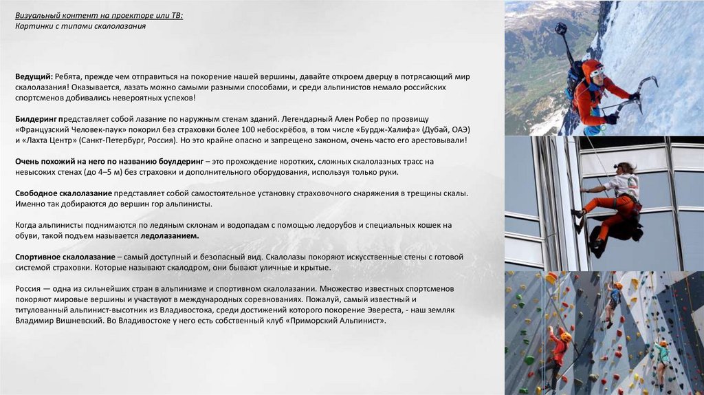 Визуальный контент на проекторе или ТВ:Картинки с типами скалолазания
