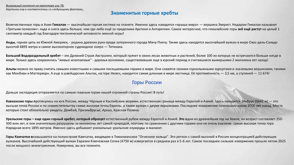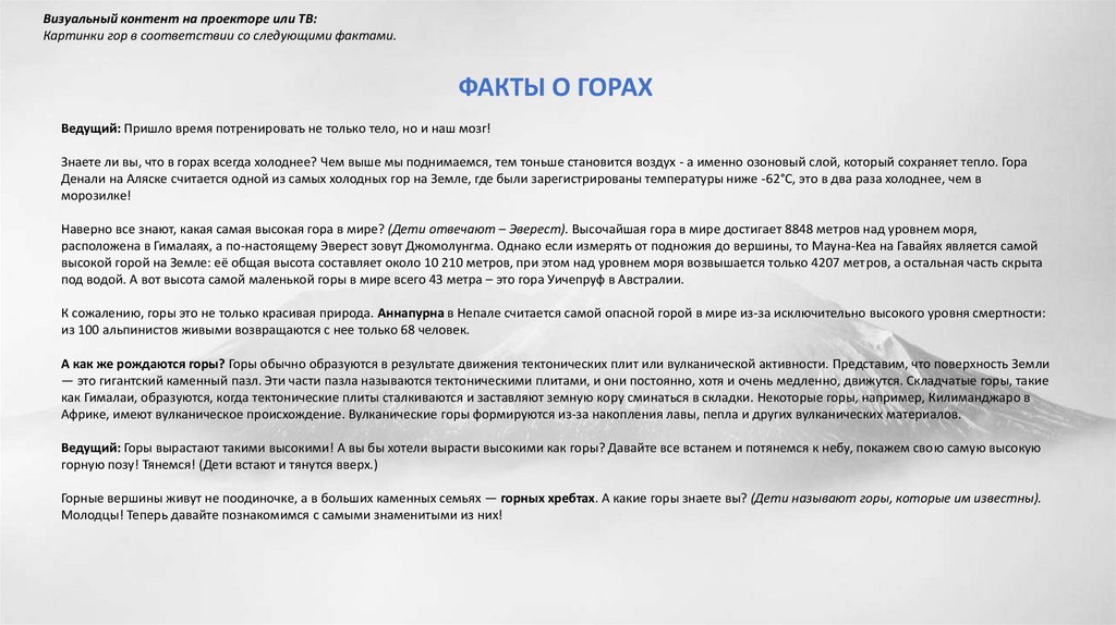Ведущий: Точно! Сегодня мы с вами покорим самую высокую вершину! Мы отправляемся в горную экспедицию! Ребята, а вы знаете, что такое