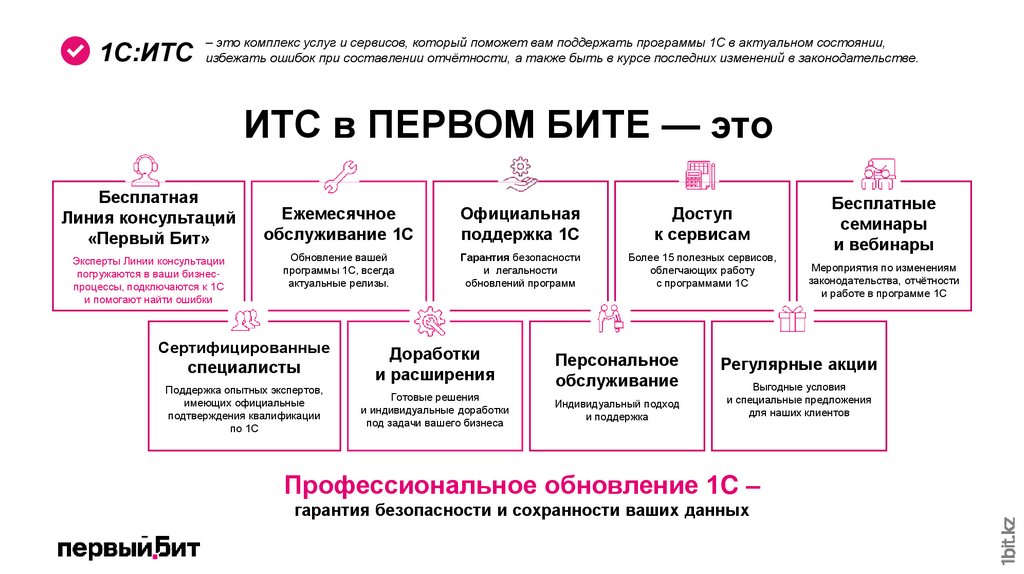 – это комплекс услуг и сервисов, который поможет вам поддержать программы 1С в актуальном состоянии,1С:ИТС избежать ошибок при составлении отчётности, а также быть в курсе последних изменений в законодательстве.