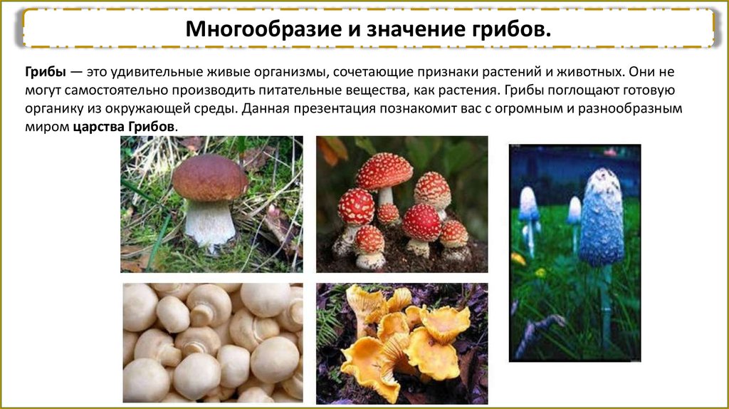Многообразие и значение грибов.Грибы — это удивительные живые организмы, сочетающие признаки растений и животных. Они не