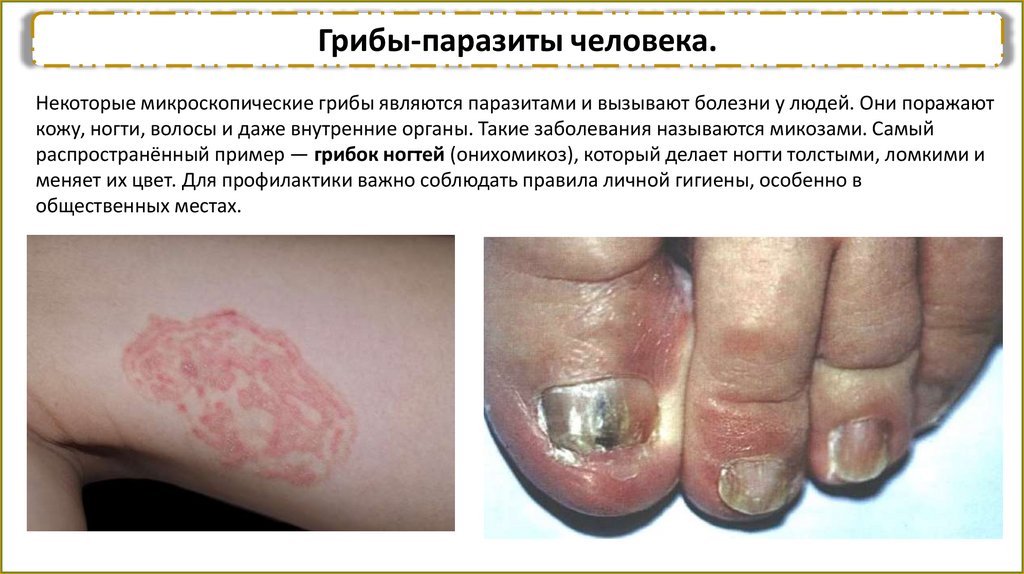 распространённый пример — грибок ногтей (онихомикоз), который делает ногти толстыми, ломкими и