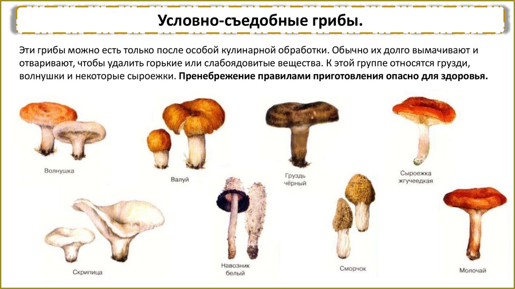 Условно-съедобные грибы.Эти грибы можно есть только после особой кулинарной обработки. Обычно их долго вымачивают и