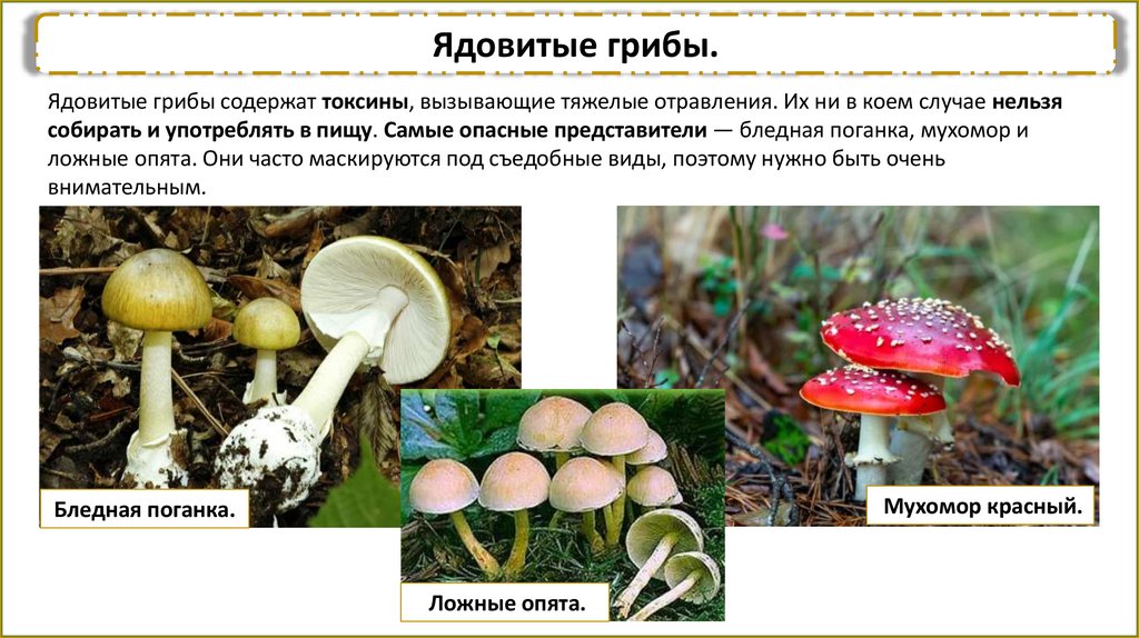 собирать и употреблять в пищу. Самые опасные представители — бледная поганка, мухомор и