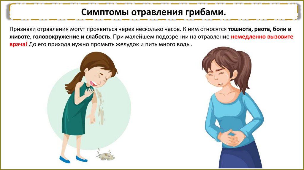 Симптомы отравления грибами.Признаки отравления могут проявиться через несколько часов. К ним относятся тошнота, рвота, боли в