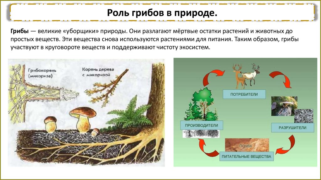 Роль грибов в природе.Грибы — великие «уборщики» природы. Они разлагают мёртвые остатки растений и животных до