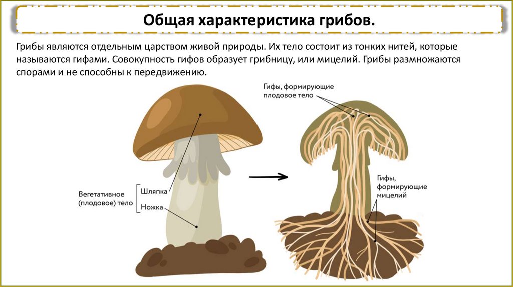 Общая характеристика грибов.Грибы являются отдельным царством живой природы. Их тело состоит из тонких нитей, которые