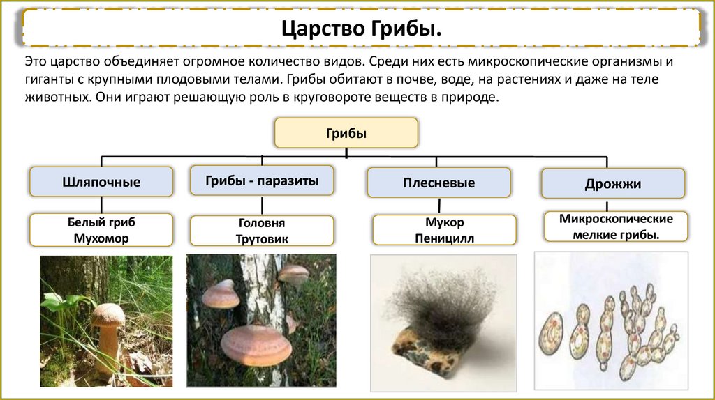 Царство Грибы.Это царство объединяет огромное количество видов. Среди них есть микроскопические организмы и