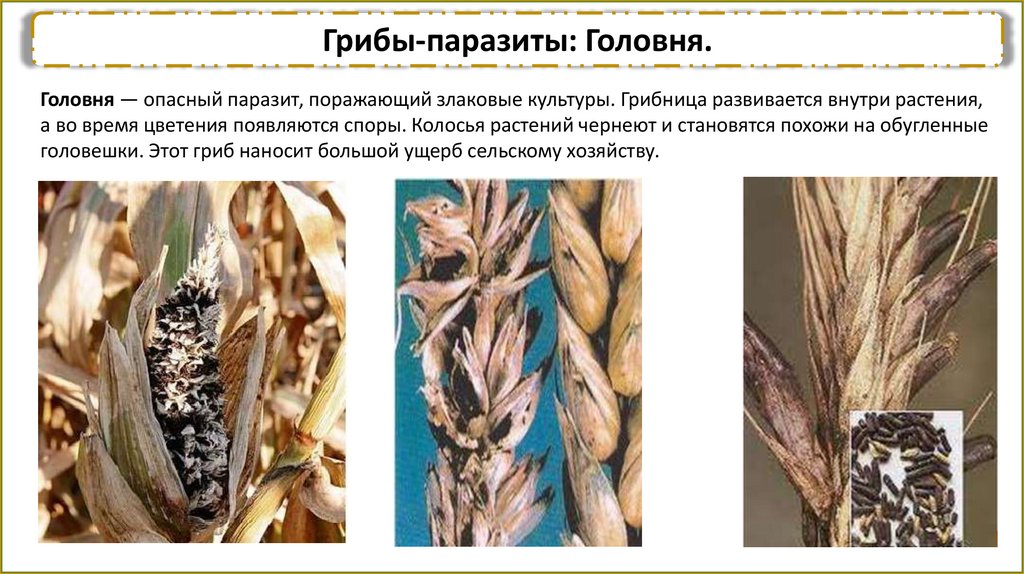 Грибы-паразиты: Головня.Головня — опасный паразит, поражающий злаковые культуры. Грибница развивается внутри растения,