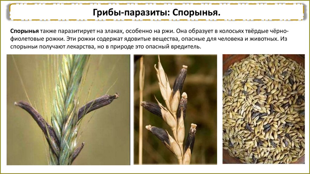 Грибы-паразиты: Спорынья.Спорынья также паразитирует на злаках, особенно на ржи. Она образует в колосьях твёрдые чёрнофиолетовые рожки. Эти рожки содержат ядовитые вещества, опасные для человека и животных. Из