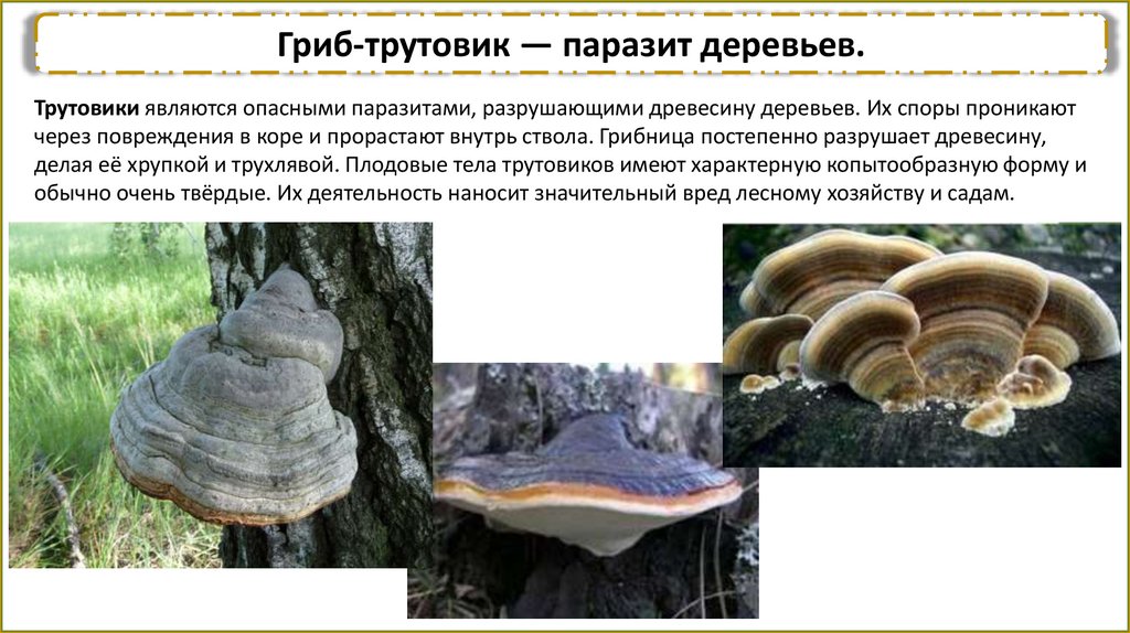 Гриб-трутовик — паразит деревьев.Трутовики являются опасными паразитами, разрушающими древесину деревьев. Их споры проникают