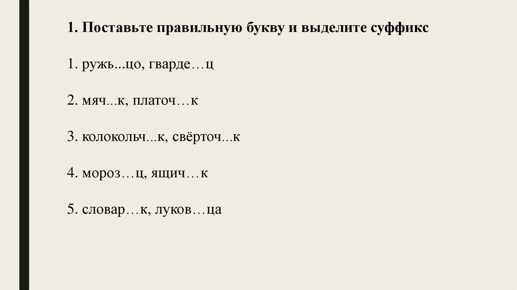 1. Поставьте правильную букву и выделите суффикс1. ружь...цо, гварде…ц