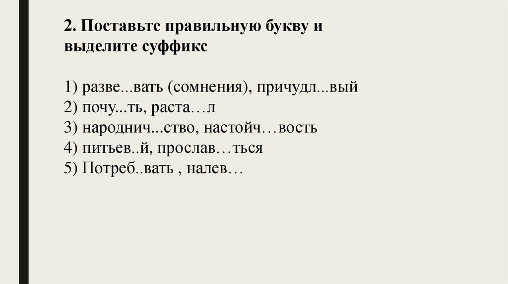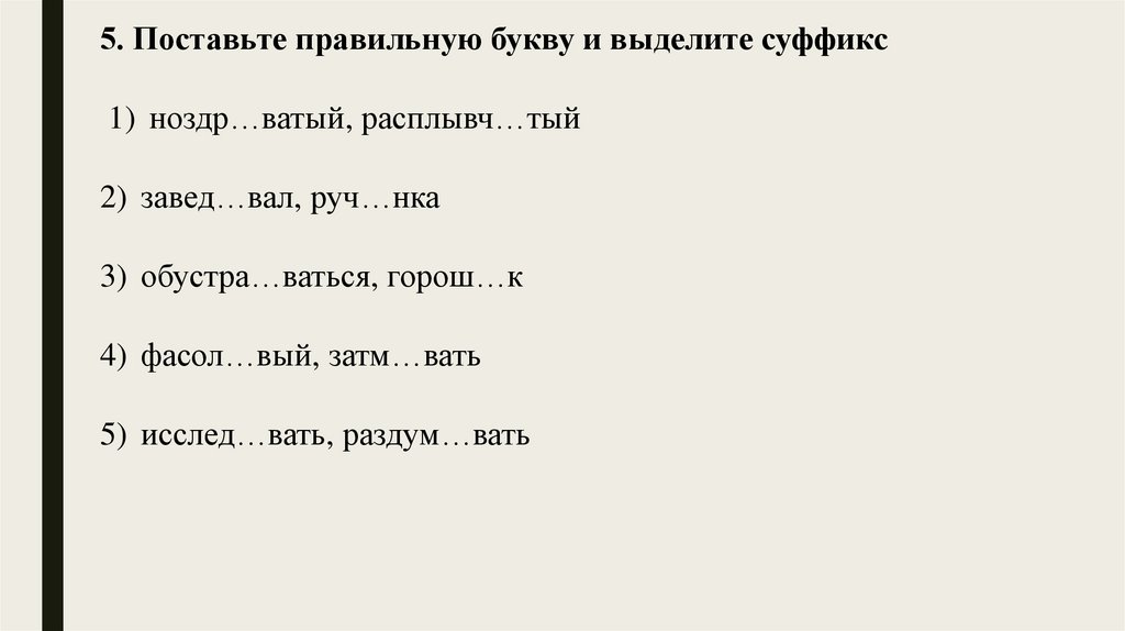 5. Поставьте правильную букву и выделите суффикс1) ноздр…ватый, расплывч…тый