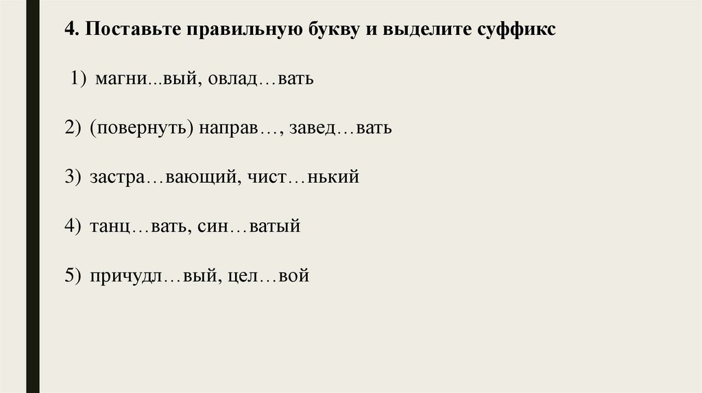 4. Поставьте правильную букву и выделите суффикс1) магни...вый, овлад…вать
