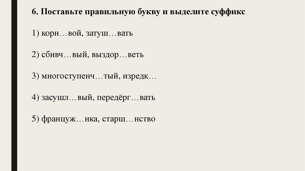 6. Поставьте правильную букву и выделите суффикс1) корн…вой, затуш…вать