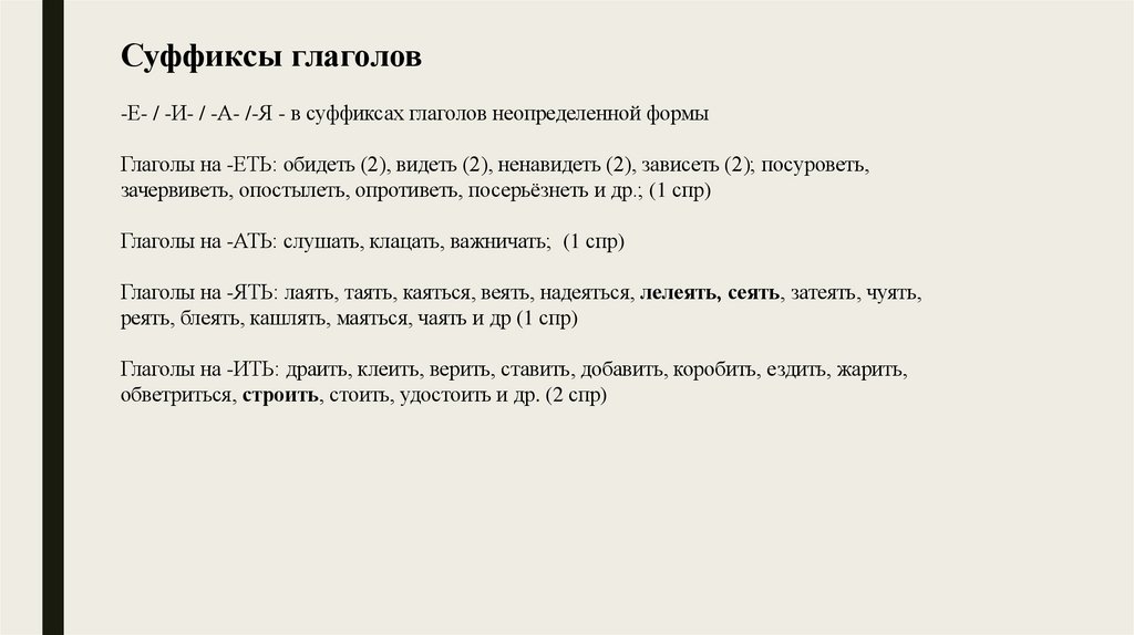 Суффиксы глаголов-Е- / -И- / -А- /-Я - в суффиксах глаголов неопределенной формы