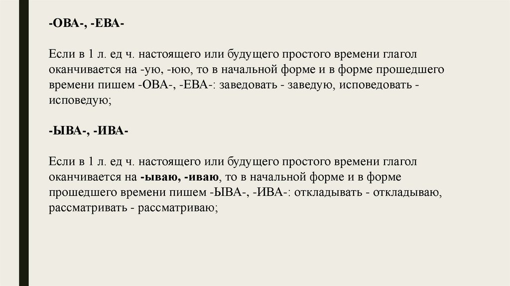 -ОВА-, -ЕВАЕсли в 1 л. ед ч. настоящего или будущего простого времени глаголоканчивается на -ую, -юю, то в начальной форме и в форме прошедшего