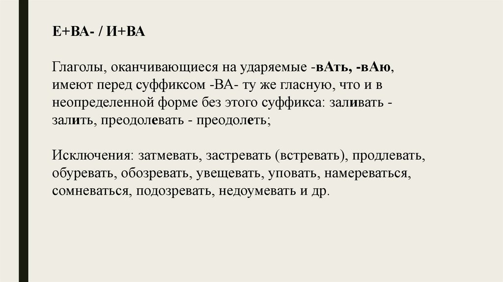 Е+ВА- / И+ВАГлаголы, оканчивающиеся на ударяемые -вАть, -вАю,