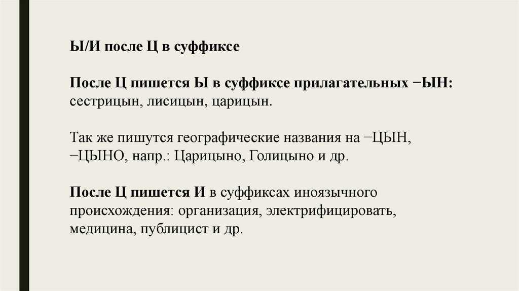Ы/И после Ц в суффиксеПосле Ц пишется Ы в суффиксе прилагательных −ЫН: