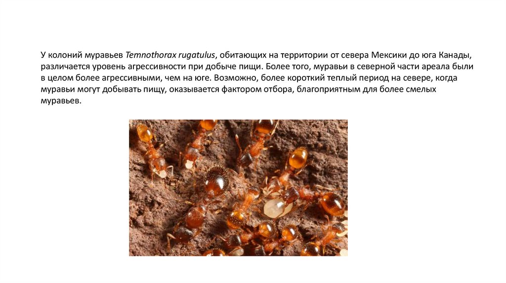 У колоний муравьев Temnothorax rugatulus, обитающих на территории от севера Мексики до юга Канады,различается уровень агрессивности при добыче пищи. Более того, муравьи в северной части ареала были