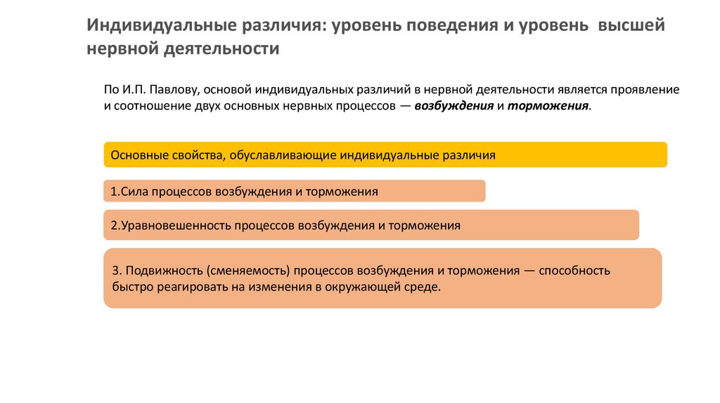 По И.П. Павлову, основой индивидуальных различий в нервной деятельности является проявление