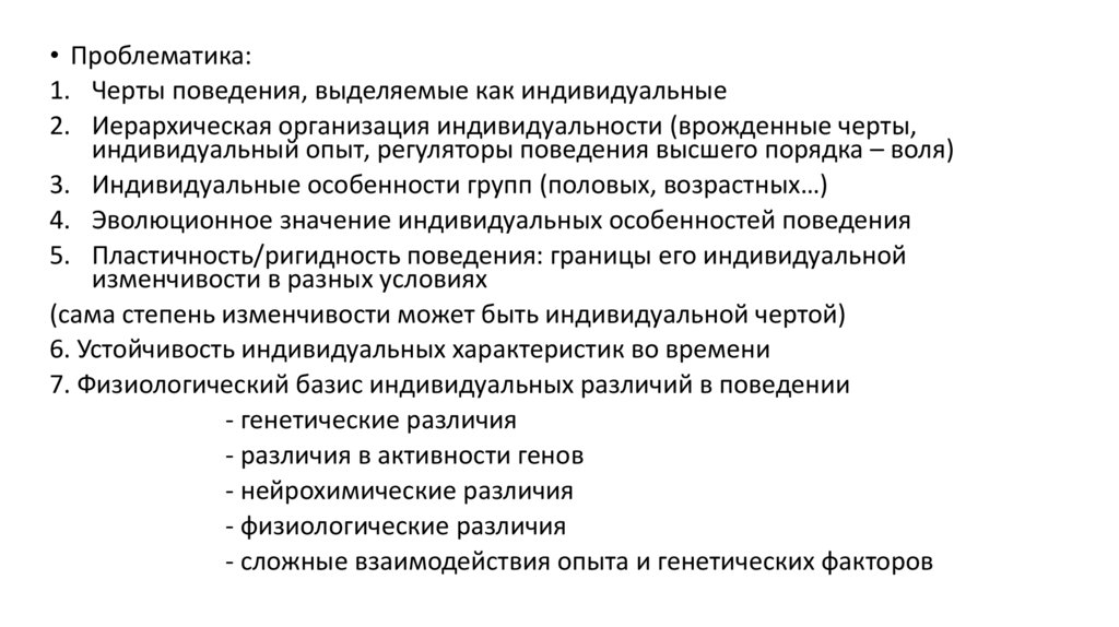 • Проблематика:1. Черты поведения, выделяемые как индивидуальные