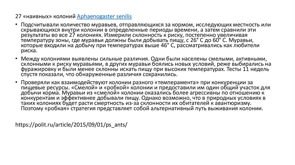 27 «наивных» колоний Aphaenogaster senilis• Подсчитывали количество муравьев, отправляющихся за кормом, исследующих местность или