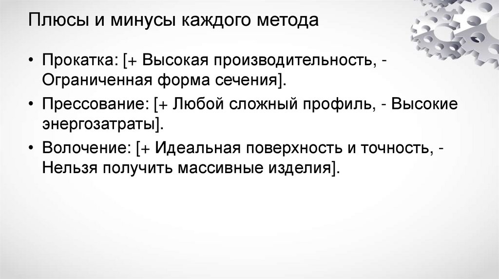 Плюсы и минусы каждого метода• Прокатка: [+ Высокая производительность, Ограниченная форма сечения].
