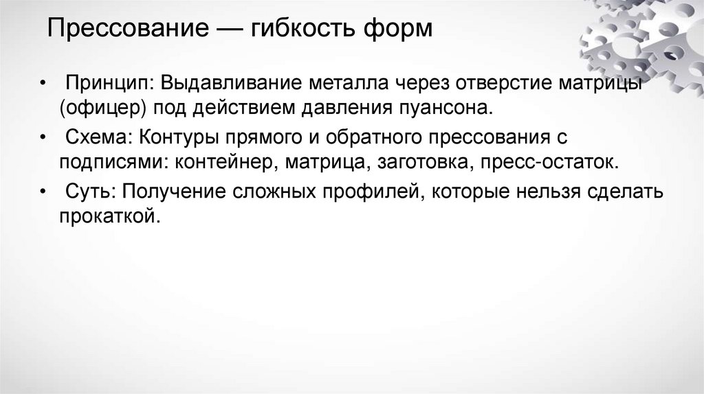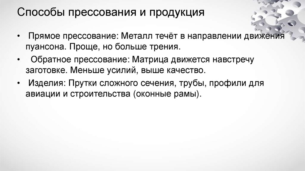 Способы прессования и продукция• Прямое прессование: Металл течёт в направлении движения