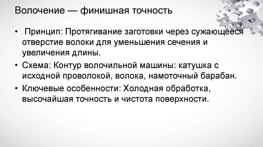 Волочение — финишная точность• Принцип: Протягивание заготовки через сужающееся