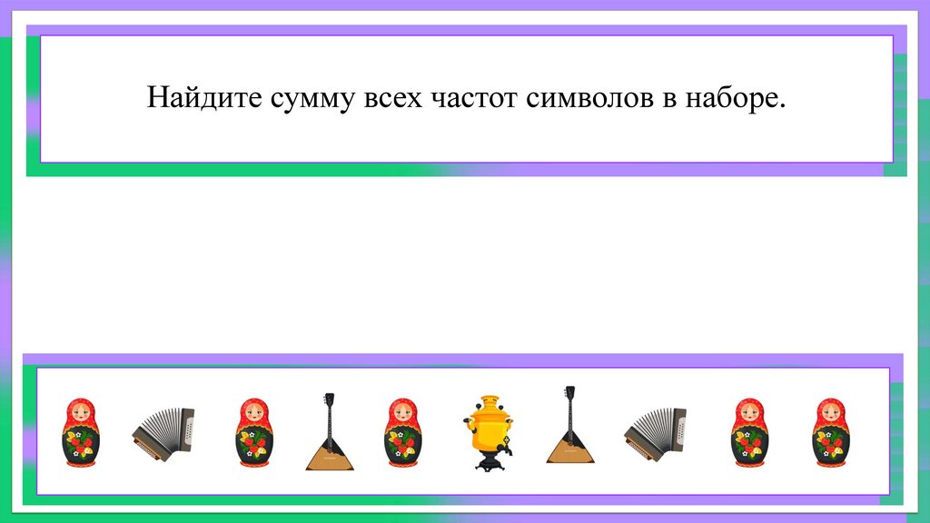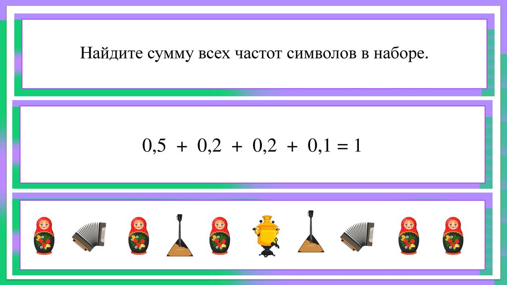 Найдите сумму всех частот символов в наборе.0,5 + 0,2 + 0,2 + 0,1 = 1