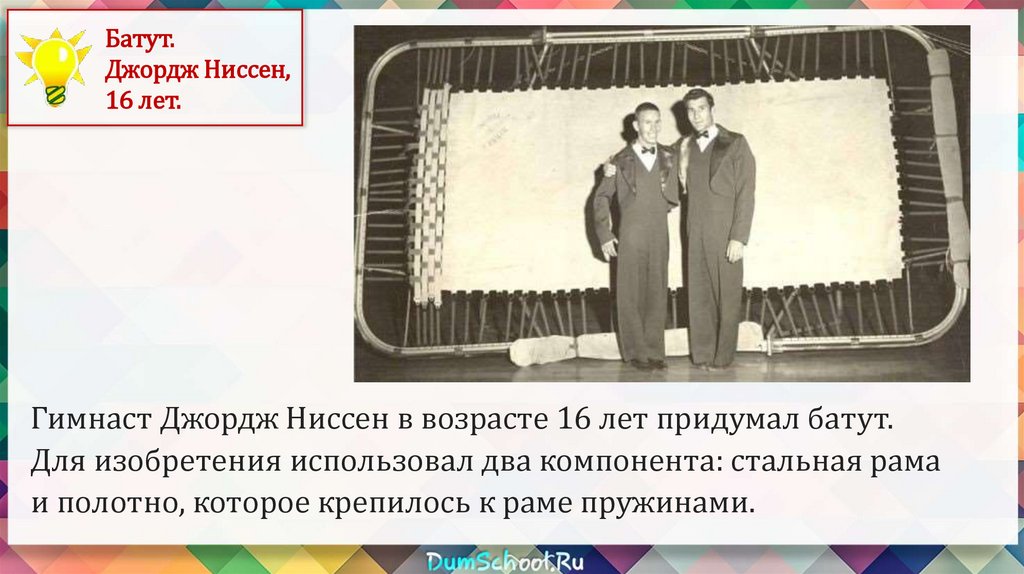 Гимнаст Джордж Ниссен в возрасте 16 лет придумал батут.