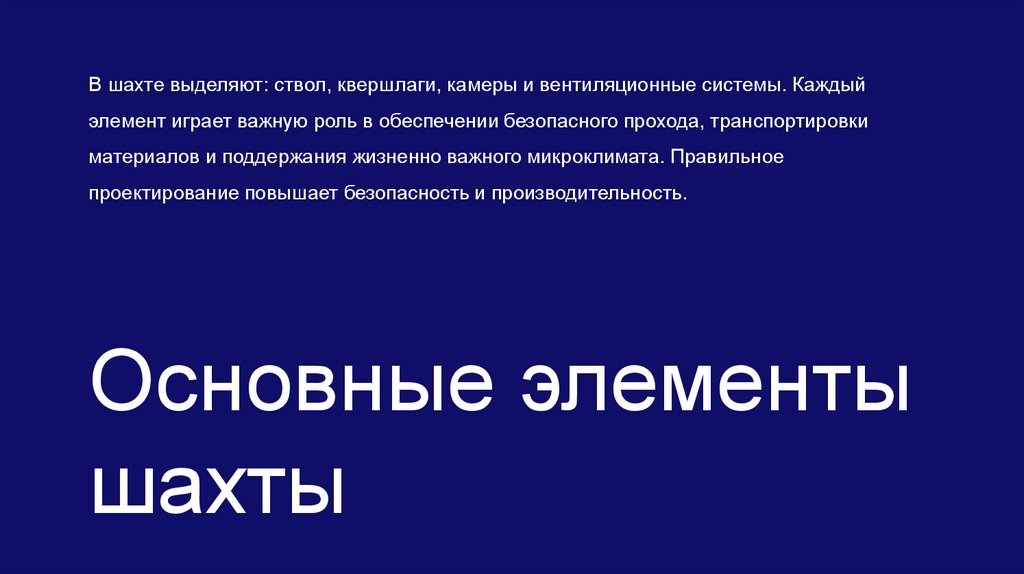 В шахте выделяют: ствол, квершлаги, камеры и вентиляционные системы. Каждыйэлемент играет важную роль в обеспечении безопасного прохода, транспортировки