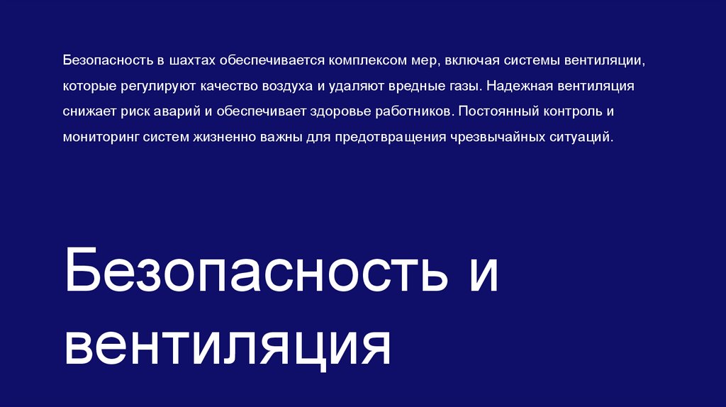 Безопасность в шахтах обеспечивается комплексом мер, включая системы вентиляции,которые регулируют качество воздуха и удаляют вредные газы. Надежная вентиляция