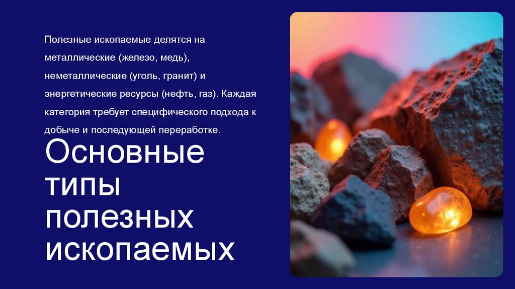Полезные ископаемые делятся наметаллические (железо, медь),