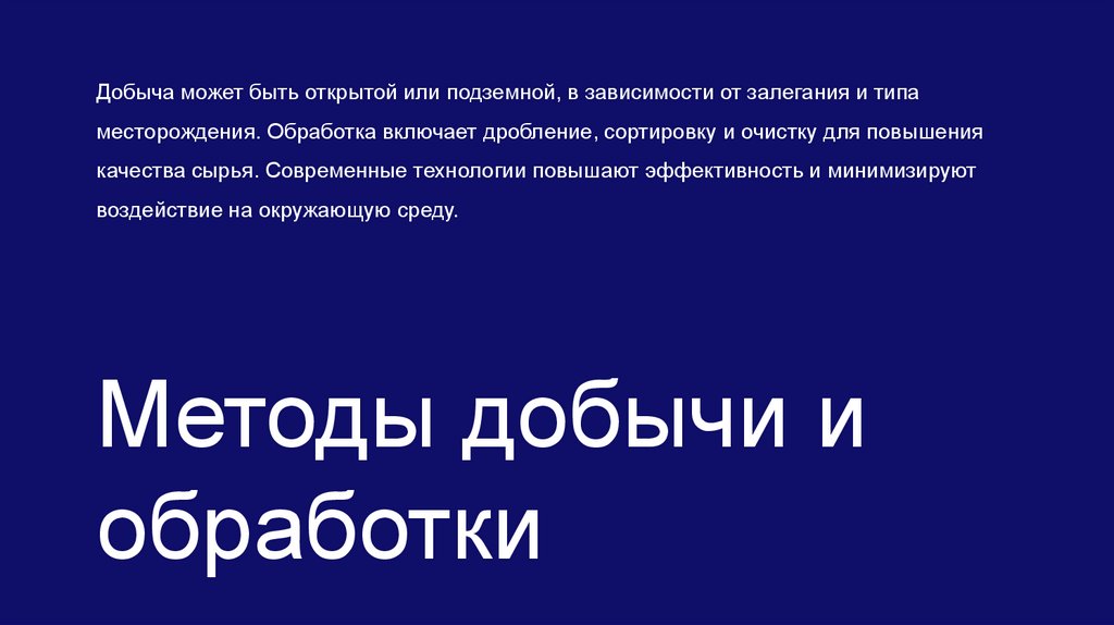 Добыча может быть открытой или подземной, в зависимости от залегания и типаместорождения. Обработка включает дробление, сортировку и очистку для повышения
