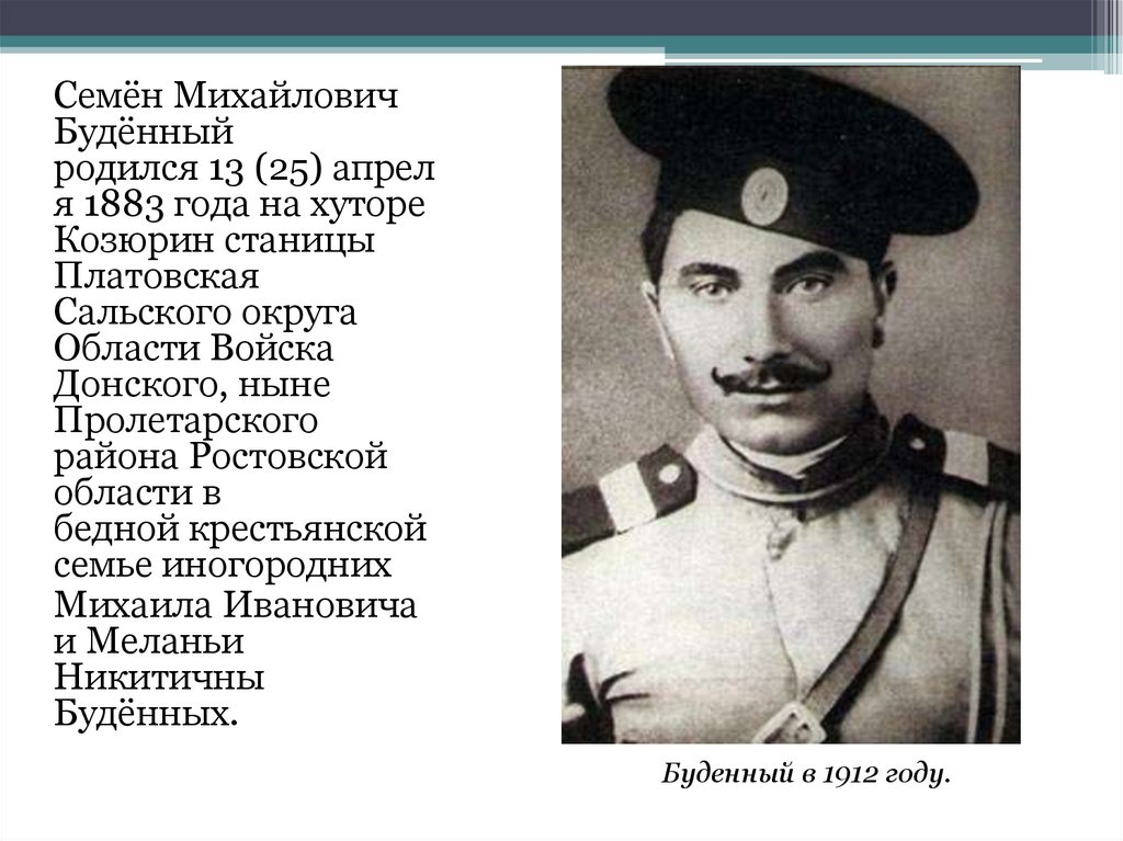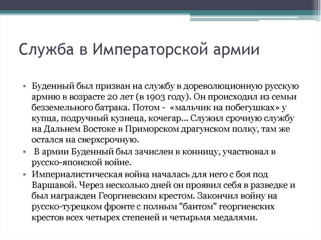 Служба в Императорской армии• Буденный был призван на службу в дореволюционную русскую