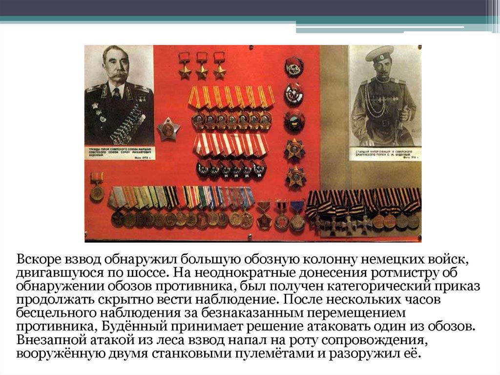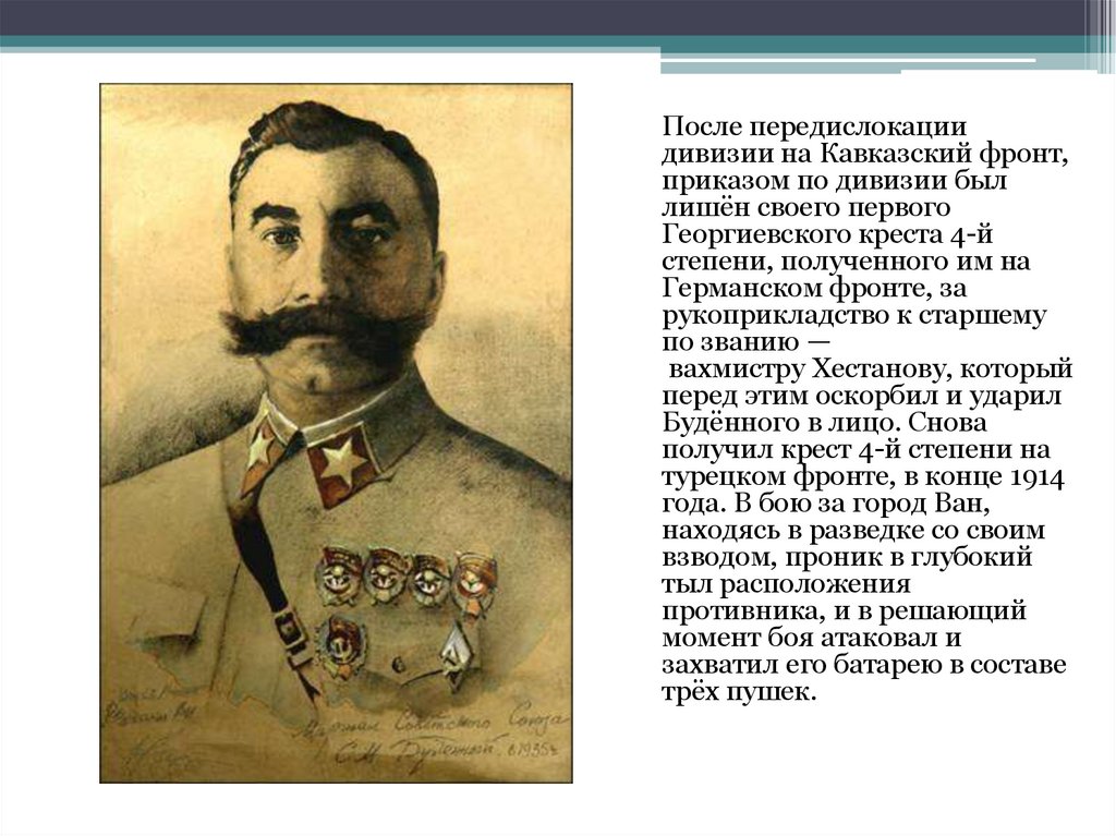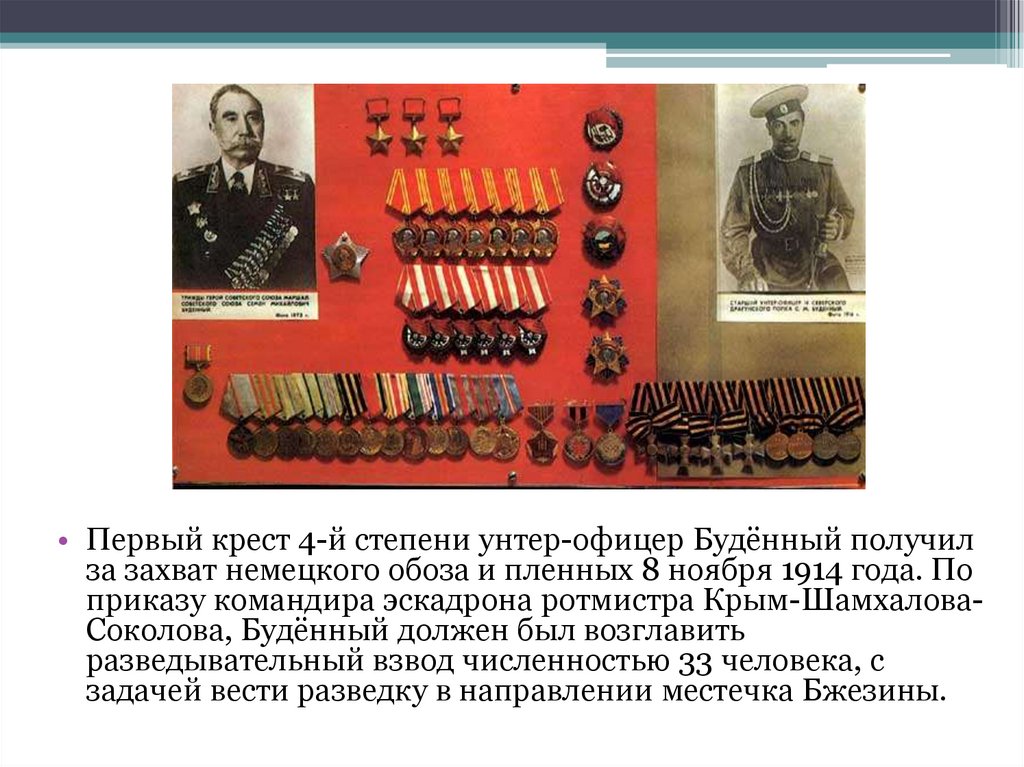• Первый крест 4-й степени унтер-офицер Будённый получилза захват немецкого обоза и пленных 8 ноября 1914 года. По