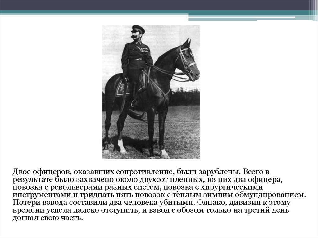 Двое офицеров, оказавших сопротивление, были зарублены. Всего врезультате было захвачено около двухсот пленных, из них два офицера,