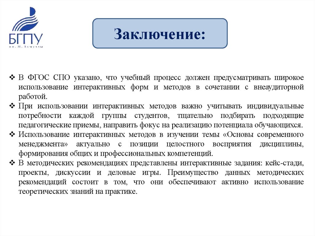 Заключение:В ФГОС СПО указано, что учебный процесс должен предусматривать широкое