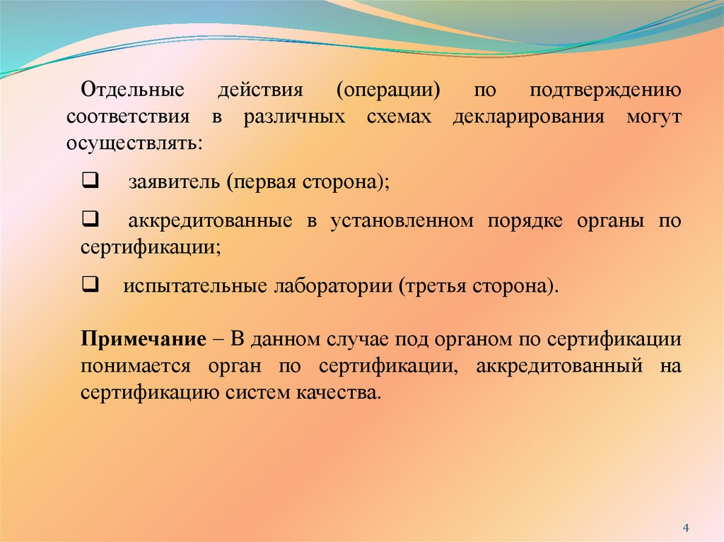Отдельные действия (операции) по подтверждениюсоответствия в различных схемах декларирования могут