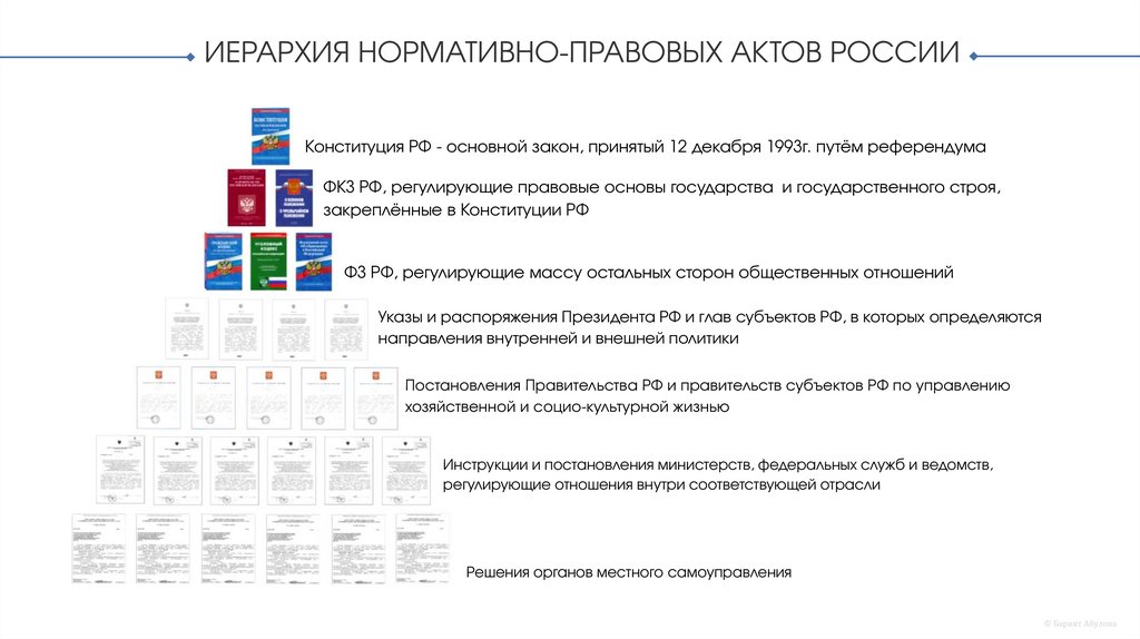 ИЕРАРХИЯ НОРМАТИВНО-ПРАВОВЫХ АКТОВ РОССИИКонституция РФ - основной закон, принятый 12 декабря 1993г. путём референдума