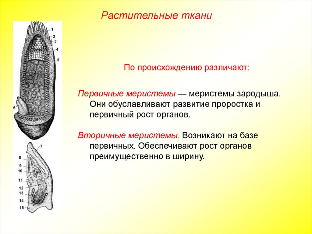 Первичная меристема. 3. Вторичная меристема. 4. Камбий. 5.