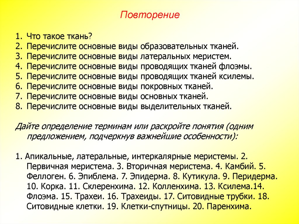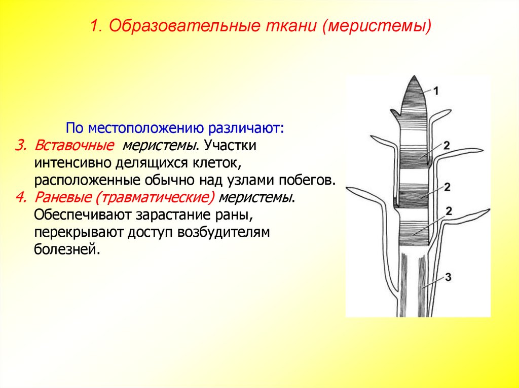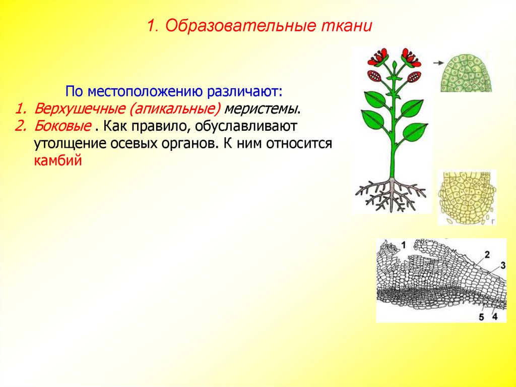 1. Апикальные, латеральные, интеркалярные меристемы. 2.