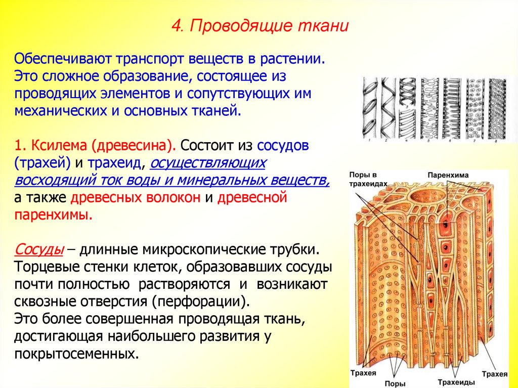 4. Проводящие тканиОбеспечивают транспорт веществ в растении.