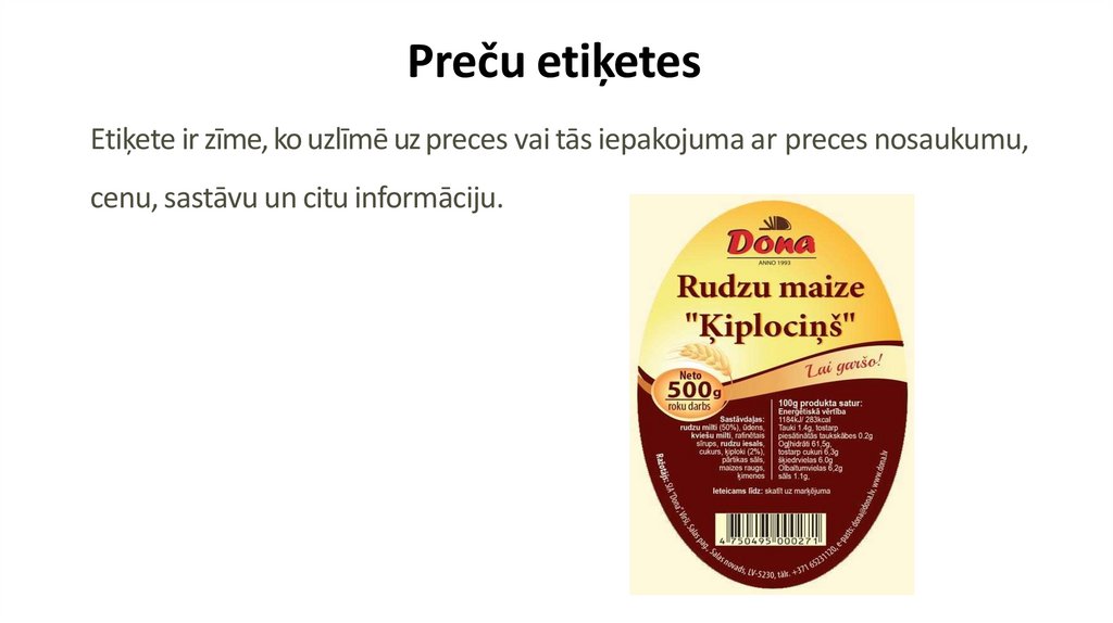 Preču etiķetesEtiķete ir zīme, ko uzlīmē uz preces vai tās iepakojuma ar preces nosaukumu,